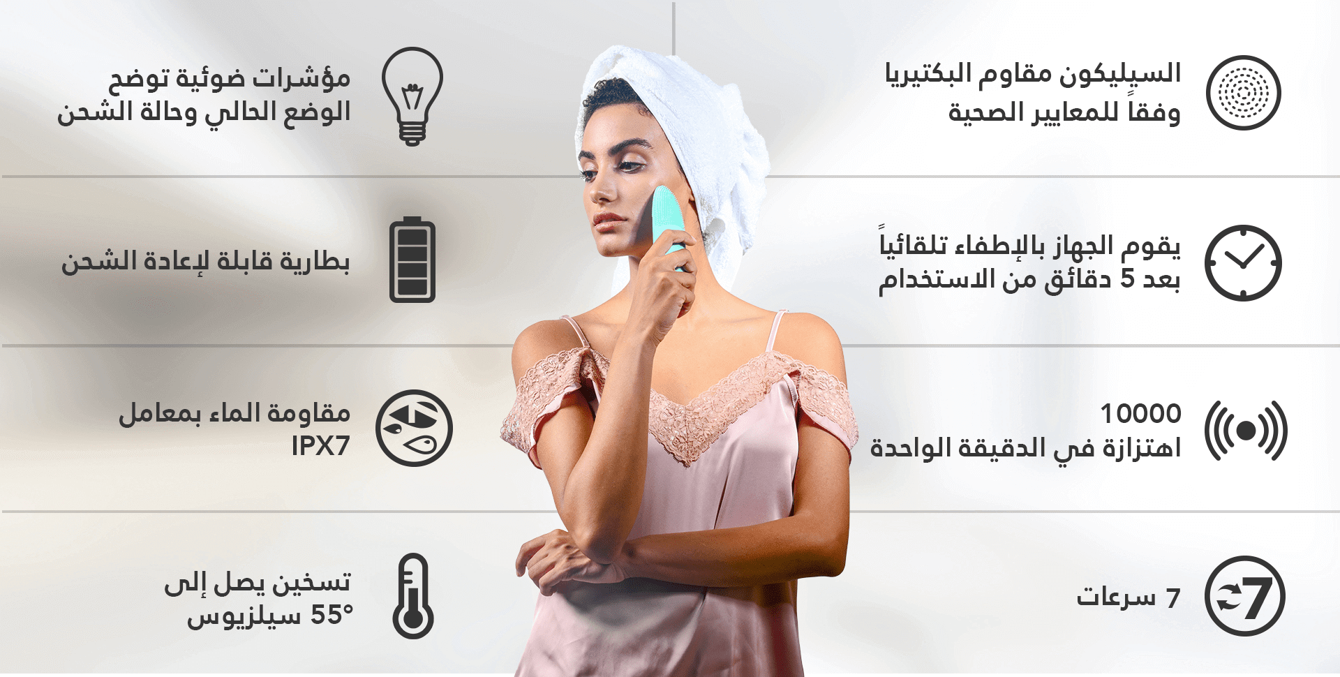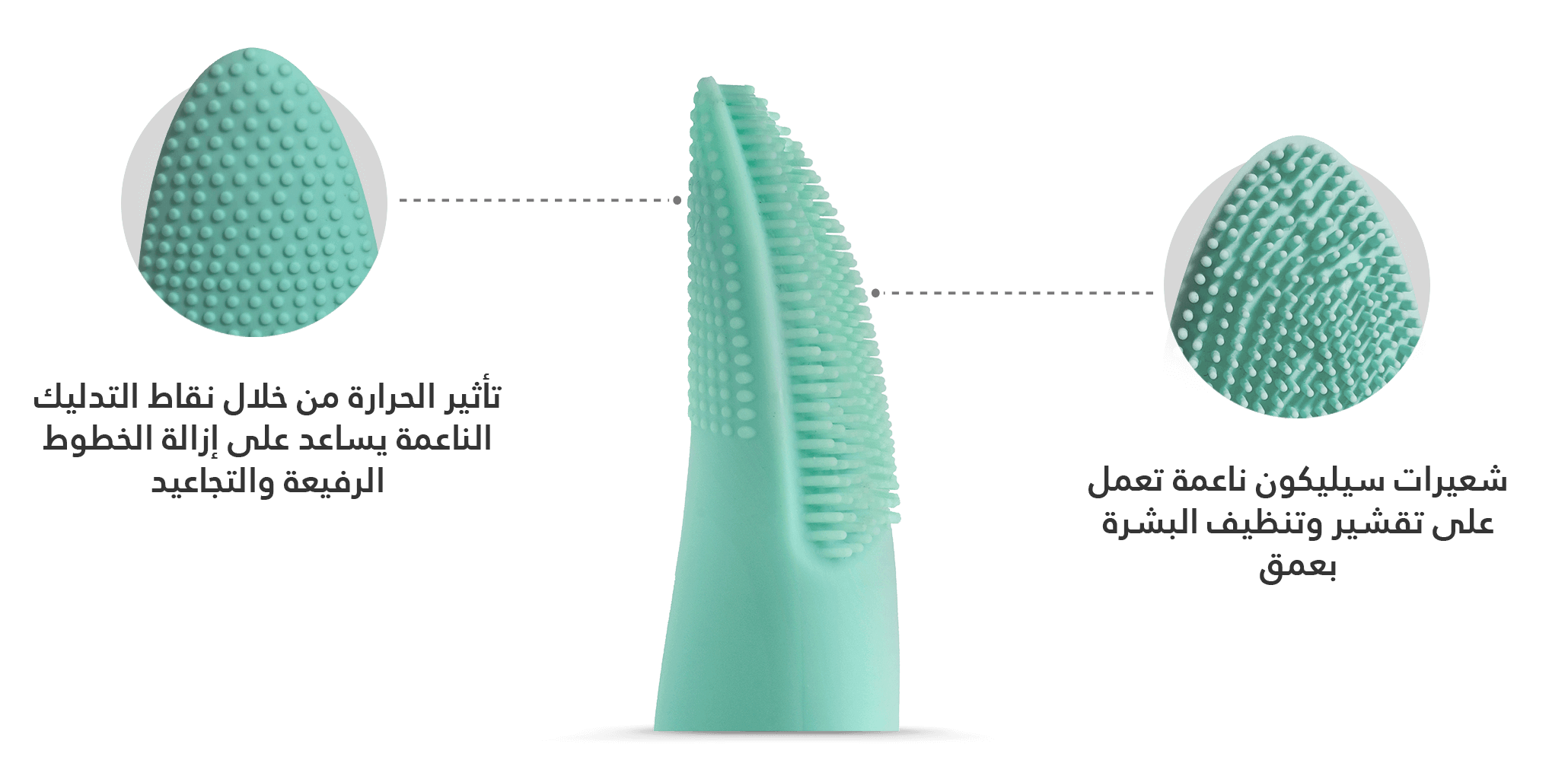 من خلال النبضات اللطيفة الصادرة من شعيرات السيليكون الأمامية التي تعمل على تقليل حجم المسام وتقشير البشرة وتنظيفها بعمق، بالإضافة إلى تأثير الحرارة من نقاط التدليك الخلفية والتي تعمل على تعزيز قدرة البشرة على امتصاص عناصر منتجات العناية بالبشرة بفعالية كما أنها تساعد على إزالة الخطوط الرفيعة وتأثير التجاعيد لبشرة ناعمة.